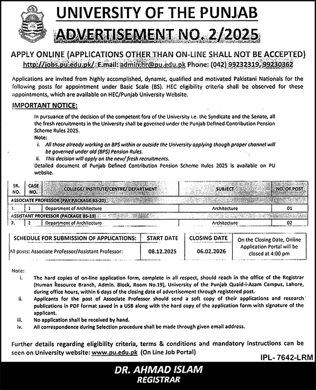 Applications must be submitted online at http://jobs.pu.edu.pk. Hard copies must follow via registered post within 6 days of the closing date.