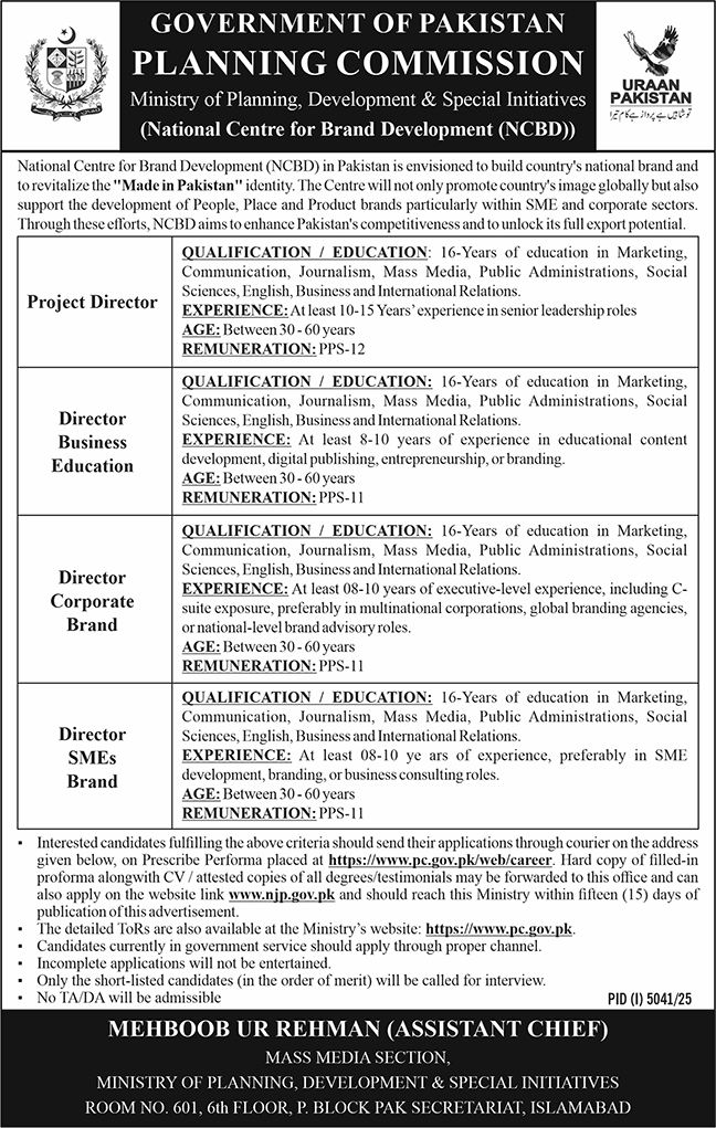 The National Centre for Brand Development (NCBD) invites applications from Pakistani nationals for key leadership positions, including Project Director, Director Business Education, Director Corporate Brand, and Director SMEs Brand. Candidates must have 16 years of education in Marketing, Communication, Journalism, Mass Media, Public Administration, Social Sciences, English, Business, or International Relations. Experience requirements vary from 8 to 15 years depending on the position, with age limits between 30 and 60 years. Applications should be submitted using the prescribed proforma available on the Ministry of Planning website, with hard copies and attested documents sent via courier or online through www.njp.gov.pk. Incomplete applications will not be considered, and only shortlisted candidates will be called for interviews. No TA/DA will be provided. Detailed terms of reference and instructions are available on the Ministry’s website.