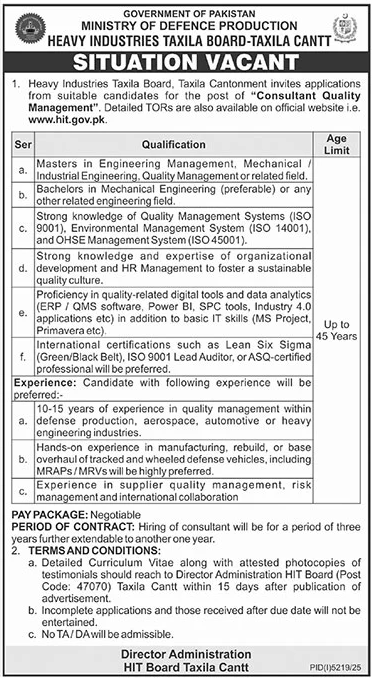 Heavy Industries Taxila Board, Taxila Cantt is seeking applications from qualified candidates for the position of Consultant Quality Management. Detailed Terms of Reference are available on the official website: www.hit.gov.pk