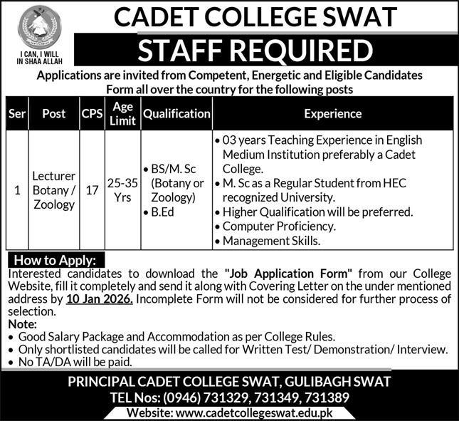Candidates with a BS/M.Sc in Botany or Zoology, a B.Ed, and at least 3 years of teaching experience in an English-medium institution can apply. Higher qualifications and experience in cadet colleges are preferred.