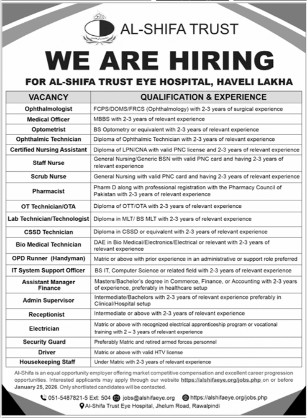 Al-Shifa Trust Jobs, Eye Hospital Careers, Ophthalmologist Jobs Pakistan, Medical Officer Jobs, Optometrist Careers, Ophthalmic Technician Jobs, Certified Nursing Assistant, Staff Nurse Jobs, Scrub Nurse Careers, Nursing Jobs Pakistan, Eye Surgeon Jobs, Surgical Nurse Hiring, OT Technician Jobs, OTA Careers, Lab Technician Jobs, Medical Technologist Careers, CSSD Technician Jobs, Bio-Medical Technician Careers, Hospital Lab Jobs, Clinical Lab Careers, Biomedical Engineering Jobs, Technical Staff in Hospitals, IT System Support Officer Jobs, Assistant Manager Finance, Admin Supervisor Careers, Receptionist Jobs, Hospital Admin Careers, Healthcare Administration Jobs, Finance Jobs in Hospitals, Accounting Jobs Healthcare, Hospital IT Careers, Computer Support in Hospitals, Electrician Jobs Pakistan, Security Guard Jobs, Driver Jobs, Housekeeping Staff Careers, OPD Runner Jobs, Hospital Support Staff, Facility Management Jobs, Hospital Operations Jobs, Healthcare Support Careers, Eye Care Jobs, Ophthalmology Jobs, Medical Staff Hiring, Clinical Staff Recruitment, Healthcare Jobs Pakistan, Nursing Opportunities, Surgical Nurse Jobs, Ophthalmology Surgeon Pakistan, Vision Care Careers, Hospital Nursing Jobs, Jobs in Haveli Lakha, Rawalpindi Jobs, Hospital Recruitment Pakistan, Healthcare Employment, Equal Opportunity Employer, Competitive Hospital Jobs, Career Growth Healthcare, Medical Job Openings, January 2026 Jobs Pakistan, Apply Online Hospital Jobs, Eye Hospital Staff Hiring, Medical Careers Rawalpindi, Eye Care Staff Pakistan, Hospital Technician Jobs, Healthcare Jobs 2026, Hospital Job Vacancies