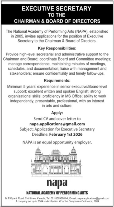 Executive Secretary NAPA, NAPA Karachi jobs 2026, Board of Directors support jobs, senior executive assistant Pakistan, administrative jobs in arts and culture, secretarial jobs Karachi, high-level executive support, MS Office jobs Pakistan, full-time executive secretary, professional administrative roles, arts and culture careers, Karachi government/NGO jobs, NAPA job openings, Board meeting coordination jobs, confidential executive support jobs