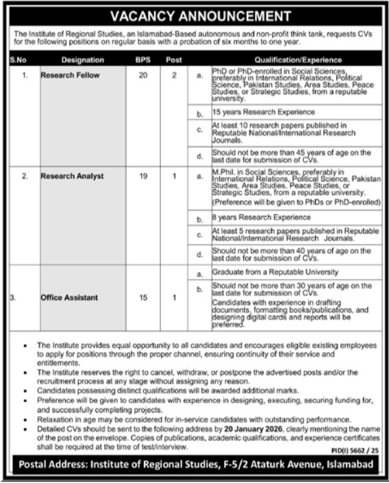 Institute of Regional Studies Islamabad jobs, Research Fellow Pakistan 2026, Research Analyst vacancies Pakistan, Office Assistant job Islamabad, Social Sciences research careers, International Relations job Pakistan, Political Science research position, Pakistan Studies career opportunities, Area Studies research job, Peace and Strategic Studies vacancy, PhD and MPhil jobs Islamabad, Experienced research positions Pakistan, Project management in research jobs, Publications and research experience required, Equal opportunity employer Islamabad