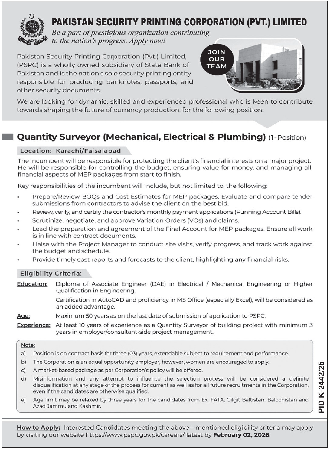 MEP quantity surveyor jobs Pakistan, quantity surveyor government organization, State Bank subsidiary jobs, MEP cost control specialist, construction cost management Pakistan, tender evaluation MEP works, BOQ preparation MEP projects, variation order management, final account preparation construction, contract based engineering jobs Pakistan, Karachi Faisalabad engineering jobs, senior quantity surveyor MEP, employer side quantity surveyor, consultant side project management, high value construction projects