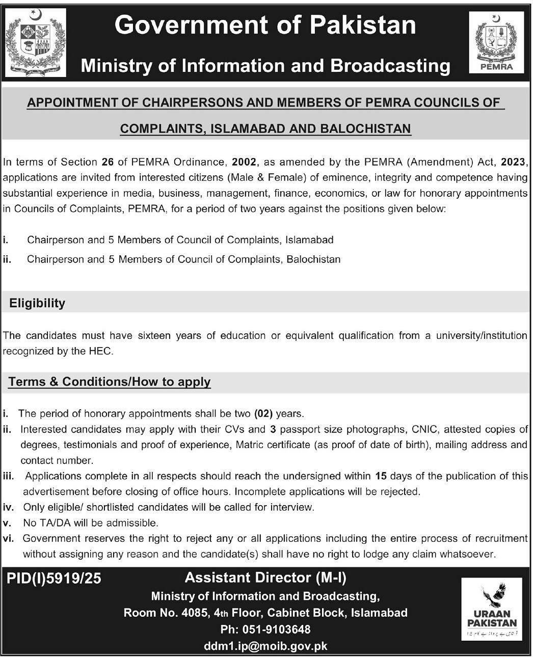 Submit your CV, attested educational and experience certificates, CNIC, domicile, and 2 passport photos