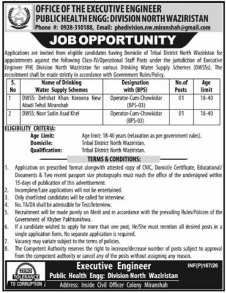 North Waziristan jobs, PHE Division North Waziristan careers, Drinking Water Supply Scheme jobs, Operator Cum Chowkidar jobs, BPS-03 jobs North Waziristan, Government jobs North Waziristan, Tribal District North Waziristan vacancies, PHE Division job opportunities, Public Health Engineering jobs, North Waziristan operational staff jobs, KP government jobs 2026, DWSS jobs North Waziristan, How to apply for PHE Division North Waziristan jobs, North Waziristan government jobs for local residents, Latest BPS-03 jobs in North Waziristan, Drinking Water Supply Scheme operator jobs, Government vacancies for Tribal District North Waziristan