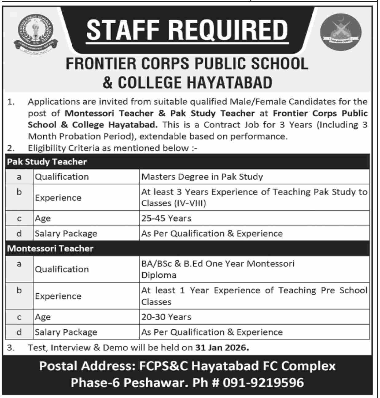 Frontier Corps Public School & College, Hayatabad, invites applications from qualified male and female candidates for the following teaching positions. This is a 3-year contract (including a 3-month probation period), extendable based on performance.