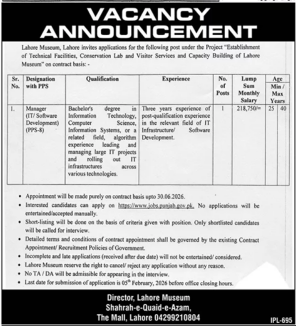| Manager (IT/Software Development) PPS-8 | Bachelor’s degree in Computer Information Technology, Computer Science, Information Systems, or related field | Minimum 3 years post-qualification experience in IT infrastructure/software development, managing large IT projects | 01 | 218,750 | 25–40 years | Contract up to 30 June 2026 | Lahore Museum, Lahore |