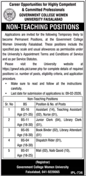 Government College Women University Faisalabad jobs, non-teaching jobs in Faisalabad, administrative jobs for women, university support staff vacancies, assistant jobs Faisalabad, teaching assistant jobs, nurse jobs Faisalabad, junior clerk jobs, library clerk vacancies, book binder positions, library attendant jobs, dispatch rider jobs, mali jobs, naib qasid vacancies, temporary to permanent university jobs, public sector university jobs, government college Faisalabad careers, careers for women in Faisalabad, university staff recruitment, 2026 Faisalabad job openings.
