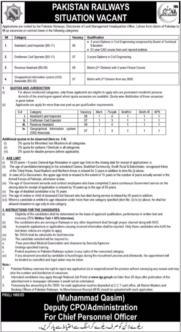 Pakistan Railways jobs 2026, Pakistan Railways contract vacancies, Assistant Land Inspector jobs, Draftsman CAD Operator vacancies, Revenue Assistant recruitment, GIS Associate jobs, public sector jobs Pakistan, government jobs Pakistan, railway jobs for fresh graduates, contract-based jobs in Pakistan Railways, railway technical jobs, Pakistan Railways career opportunities, BS-11 jobs Pakistan, BS-02 jobs Pakistan, engineering diploma jobs, CAD operator careers, GIS jobs Pakistan, government vacancies 2026, railway recruitment online application, National Job Portal Pakistan.