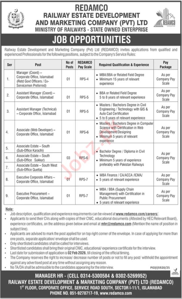 Railway Estate Development and Marketing Company (REDAMCO) invites applications from qualified and experienced professionals for the following positions, in line with the Company’s service rules.