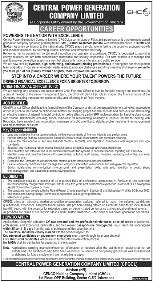 CPGCL jobs 2026, Central Power Generation Company Limited careers, CFO jobs in Pakistan, Chief Financial Officer vacancy Pakistan, Power sector senior management jobs, Guddu power plant jobs, Government-owned company finance jobs, Contract CFO jobs Pakistan, Energy sector executive jobs, Finance leadership jobs Pakistan