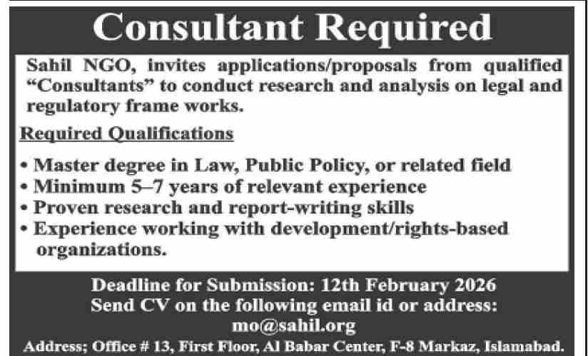 Sahil NGO consultant jobs 2026, legal research consultant Islamabad, regulatory framework research jobs, rights-based organization consultancy, public policy research jobs, NGO research consultant Pakistan, report writing consultant jobs, development sector consultancy, Islamabad NGO careers, legal and policy analysis jobs, Sahil NGO recruitment 2026, consultancy opportunities Pakistan, research and analysis consultant roles.