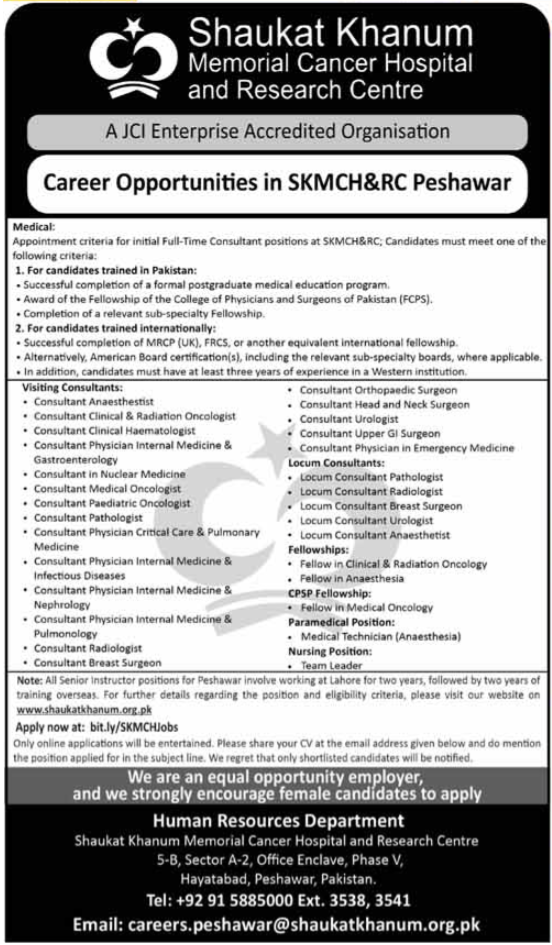 Applications are accepted online only at bit.ly/SKMCHJobs. Send your CV to careers.peshawar@shaukatkhanum.org.pk, mentioning the position in the email subject line.