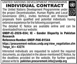 | 1 | Research on Gender Disparity in Pakistan | UNDP-PAK-01544 / UNDP-IC-2026-034 | Qualified individuals with extensive technical and financial experience in gender research, data analysis, and relevant methodologies | Pakistan | Individual Contract (IC) | As per UNDP website |