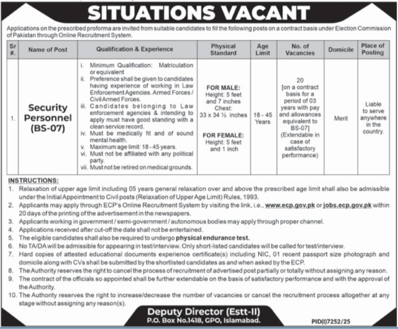 ECP jobs 2026, Election Commission of Pakistan vacancies, Security Personnel jobs Pakistan, BS-07 ECP jobs, Government contract jobs Pakistan, Physical test required jobs Pakistan, Apply online ECP careers, ECP security jobs 2026, Pakistan federal jobs 2026, Law enforcement experience jobs
