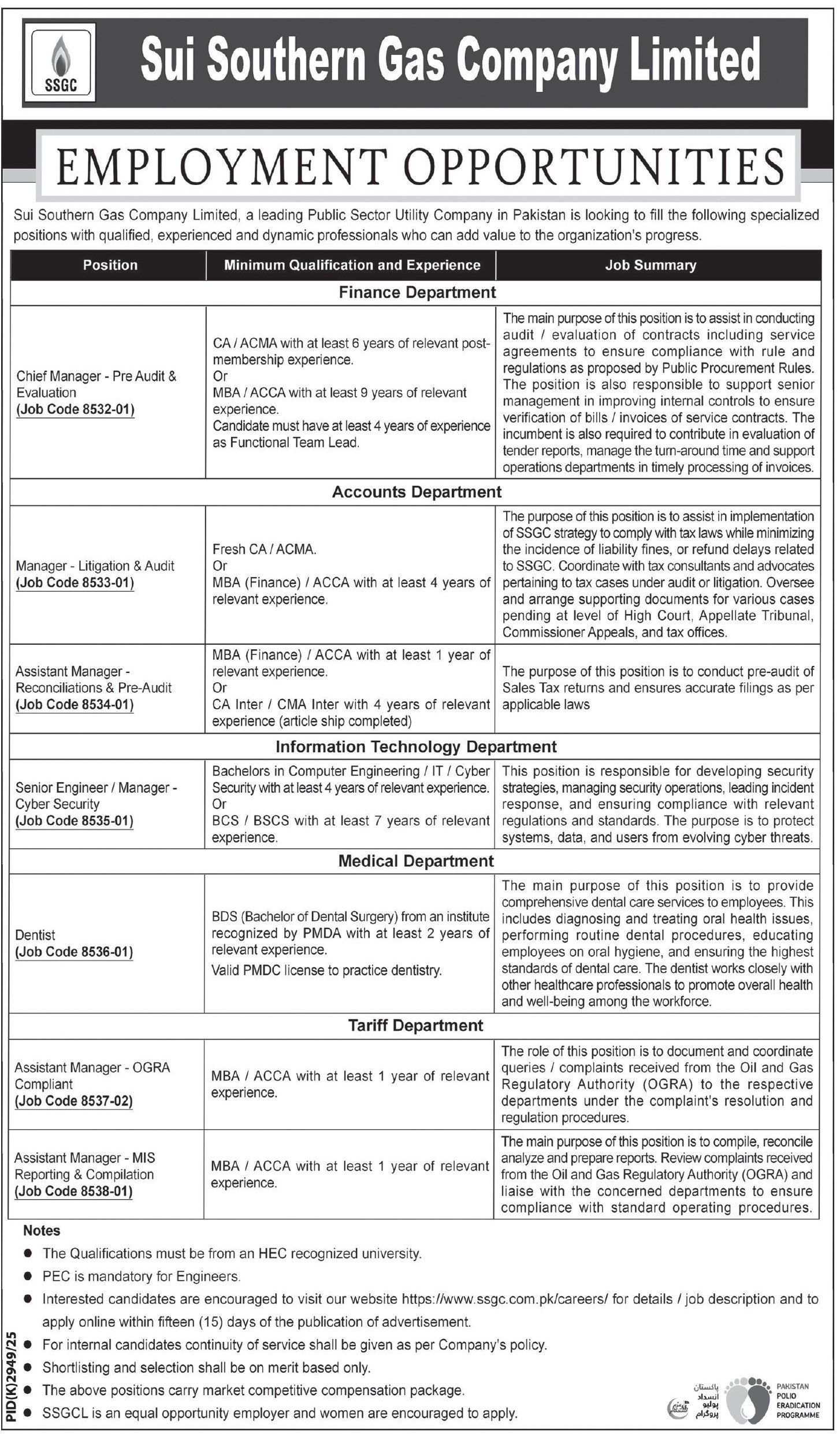 SSGC jobs 2026, Sui Southern Gas Company vacancies, Chief Manager Pre Audit & Evaluation jobs, Manager Litigation & Audit jobs, Assistant Manager Reconciliations & Pre-Audit jobs, Senior Engineer Cyber Security jobs, Dentist jobs SSGC, Assistant Manager OGRA Compliance jobs, Assistant Manager MIS Reporting jobs, Finance jobs SSGC, IT jobs SSGC, Medical jobs SSGC, Tariff department jobs Pakistan, Apply online SSGC careers, Pakistan public sector jobs 2026, Equal opportunity employer Pakistan, SSGC career opportunities, Karachi SSGC jobs