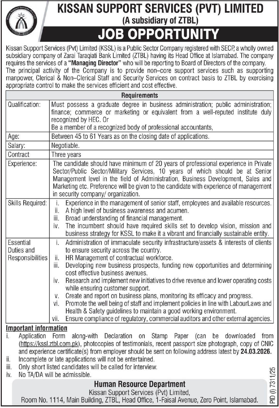 Kissan Support Services, KSSL, ZTBL subsidiary, Managing Director, senior management jobs, administration jobs, business development, security management, HR management, Pakistan jobs, contract jobs, Islamabad, executive vacancies, leadership roles, corporate management, public sector careers, private sector careers
