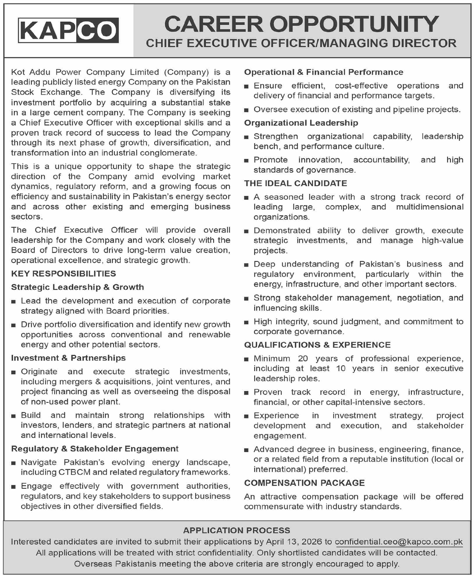 | 1 | Chief Executive Officer / Managing Director | Kot Addu Power Company Limited (KAPCO) | Kot Addu, Pakistan | Advanced degree in Business, Engineering, Finance, or related field preferred | Minimum 20 years professional experience with at least 10 years in senior executive leadership roles | Lead corporate strategy, drive business growth, manage investments and partnerships, oversee operations and financial performance, ensure regulatory compliance, and strengthen organizational leadership | Contract / Executive Leadership |