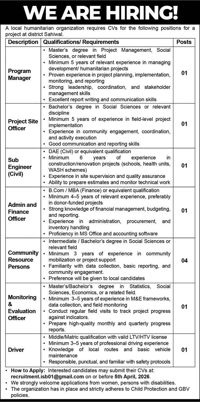 Sahiwal jobs 2026, NGO jobs Pakistan, humanitarian jobs Sahiwal, program manager jobs Pakistan, M&E officer jobs, project site officer jobs, civil sub engineer jobs Pakistan, finance officer NGO jobs, community worker jobs Pakistan, driver jobs Sahiwal NGO, donor funded project jobs Pakistan