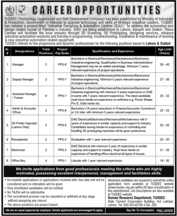 TUSDEC jobs 2026, TUSDEC careers Pakistan, IDAC project jobs, Lahore jobs 2026, Sialkot jobs 2026, government project jobs Pakistan, engineering jobs Pakistan, electrical engineer jobs, mechanical engineer jobs Pakistan, mechatronics jobs, industrial automation jobs, 3D printer operator jobs, admin and accounts jobs Pakistan, receptionist jobs Lahore, electrician jobs Pakistan, office boy jobs, PPS scale jobs Pakistan, contract jobs Pakistan, latest jobs in TUSDEC, TUSDEC application online, www.tusdec.org.pk jobs