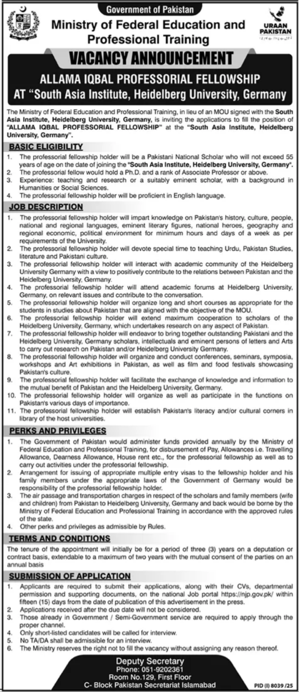 The Ministry of Federal Education and Professional Training invites applications from Pakistani scholars for the prestigious Allama Iqbal Professorial Fellowship at the South Asia Institute, Heidelberg University, Germany. This role focuses on promoting Pakistan’s culture, language, and academic collaboration at an international level.