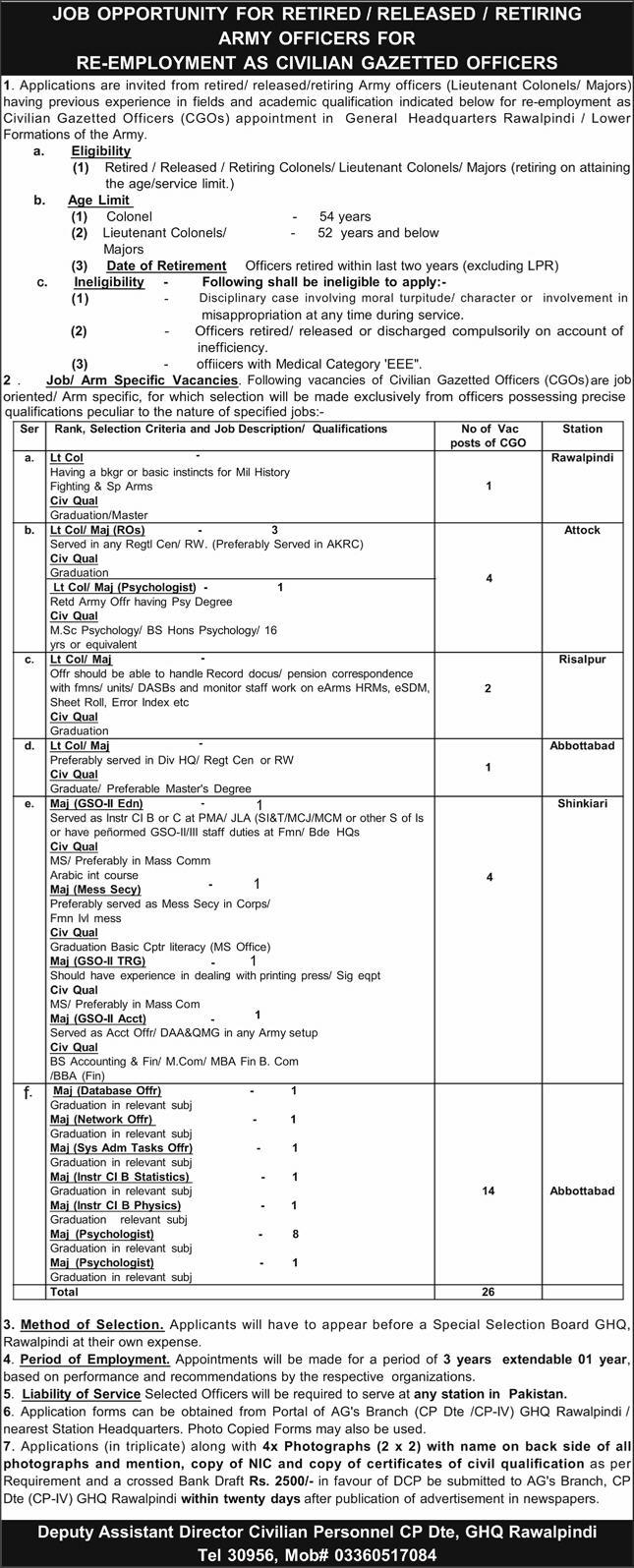 General Headquarters Rawalpindi invites applications from retired, released, or retiring Army officers for re-employment as Civilian Gazetted Officers. These positions are based on specific experience and qualifications and offer an opportunity to continue service in administrative, technical, and instructional roles.