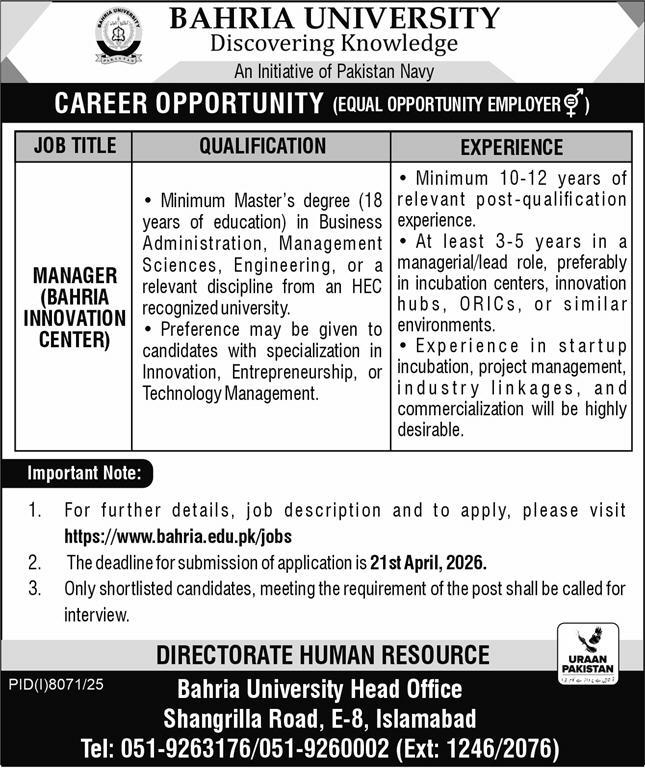 | 1 | Manager (Bahria Innovation Center) | Master’s degree with 18 years of education in Business Administration, Management Sciences, Engineering, or relevant field from HEC recognized university | 10 to 12 years post-qualification experience, including 3 to 5 years in managerial role, preferably in innovation centers, incubation hubs, or ORICs | Full-time |