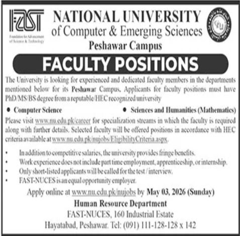 FAST NUCES jobs 2026, faculty jobs Pakistan, university lecturer jobs Peshawar, assistant professor jobs Pakistan, professor jobs Pakistan, computer science jobs Pakistan, mathematics lecturer jobs, HEC faculty jobs Pakistan, teaching jobs university Pakistan, academic jobs Peshawar 2026, higher education jobs Pakistan, FAST university careers, PhD jobs Pakistan, MS lecturer jobs Pakistan