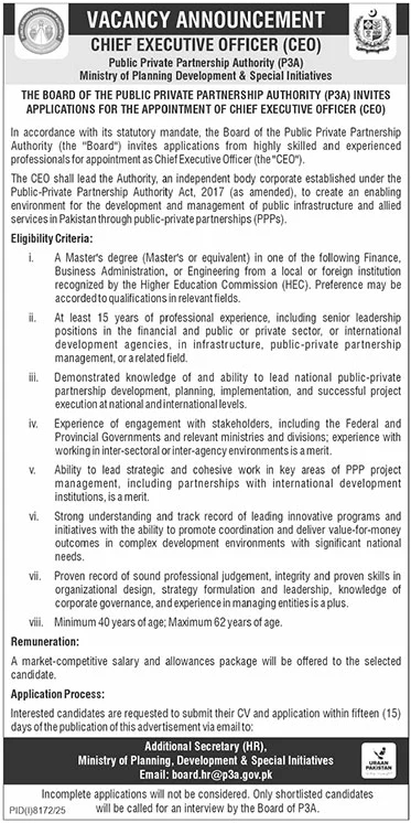 | Chief Executive Officer CEO | Public Private Partnership Authority P3A | Master’s degree in Finance, Business Administration, Engineering or equivalent from HEC recognized institution | Minimum 15 years of professional experience including senior leadership roles in public or private sector or international development organizations, preferably in PPPs or infrastructure projects | Minimum 40 years, Maximum 62 years | Pakistan (Islamabad based office) |