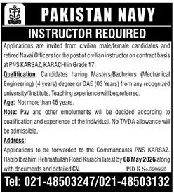 | Instructor (Grade 17) | Pakistan Navy | Bachelor’s or Master’s in Mechanical Engineering or 3 years DAE from recognized institute | Teaching experience preferred | Maximum 45 years | PNS Karsaz, Karachi |