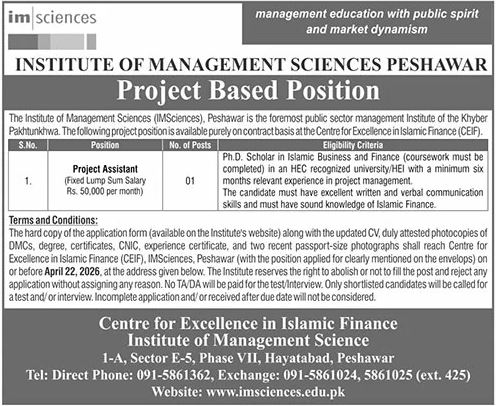 IMSciences jobs 2026, Peshawar jobs Islamic finance, project assistant jobs Pakistan, Islamic finance research jobs, CEIF jobs Peshawar, contract jobs KPK 2026, research assistant jobs Pakistan, finance analyst jobs Peshawar, academic jobs Islamic finance Pakistan, management sciences jobs Pakistan, project management jobs Peshawar, public sector jobs KPK