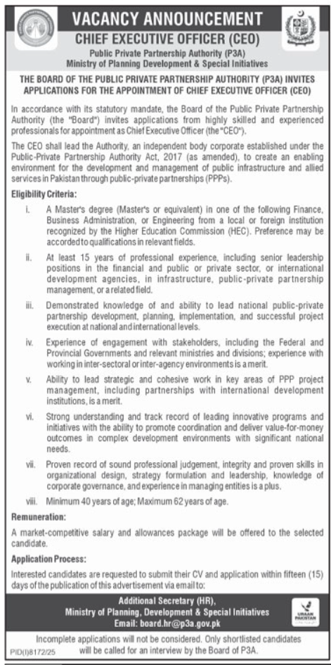 The Board of P3A under the Ministry of Planning, Development & Special Initiatives is inviting applications from highly experienced professionals for the position of CEO.