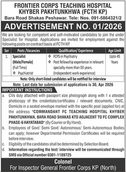 FC Teaching Hospital jobs 2026, psychiatrist jobs Pakistan, FCPS psychiatry jobs KP, medical specialist jobs Peshawar, Frontier Corps hospital vacancies, consultant psychiatrist job Pakistan, FC hospital KP jobs, latest doctor jobs 2026 Pakistan, psychiatry government contract jobs KP, FC teaching hospital careers, medical jobs in Hayatabad Peshawar, FCPS jobs psychiatry Pakistan, healthcare jobs KP 2026, specialist doctor vacancy Pakistan, Peshawar hospital jobs psychiatrist.