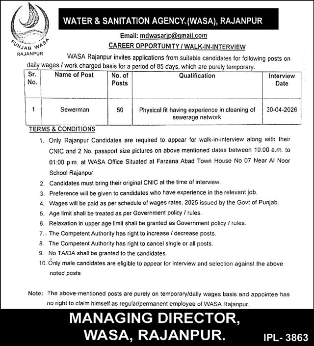 Water and Sanitation Agency (WASA) Rajanpur invites candidates for walk-in interview on temporary daily wage posts.