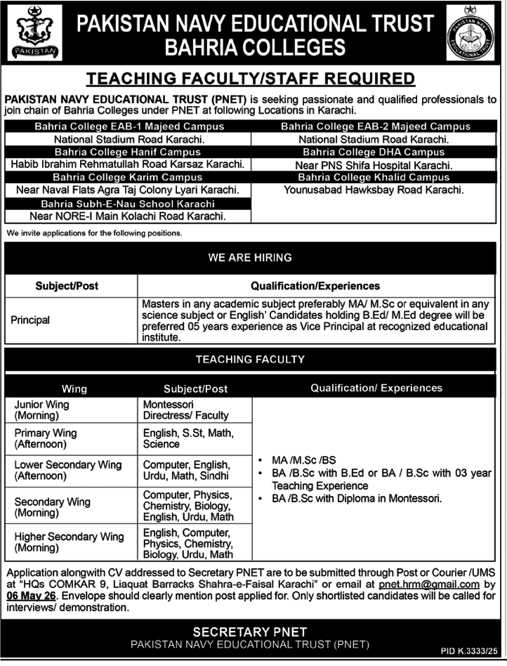 Bahria College jobs 2026, PNET jobs Karachi, Pakistan Navy schools jobs, teaching jobs Karachi 2026, principal jobs Pakistan schools, Montessori teacher jobs Karachi, Bahria Colleges faculty jobs, English teacher Karachi jobs, physics teacher jobs Pakistan, chemistry teacher jobs Karachi, computer teacher jobs Pakistan, school teacher jobs Bahria Karachi, higher secondary teacher jobs Pakistan, Karachi education jobs 2026, Navy educational trust jobs.