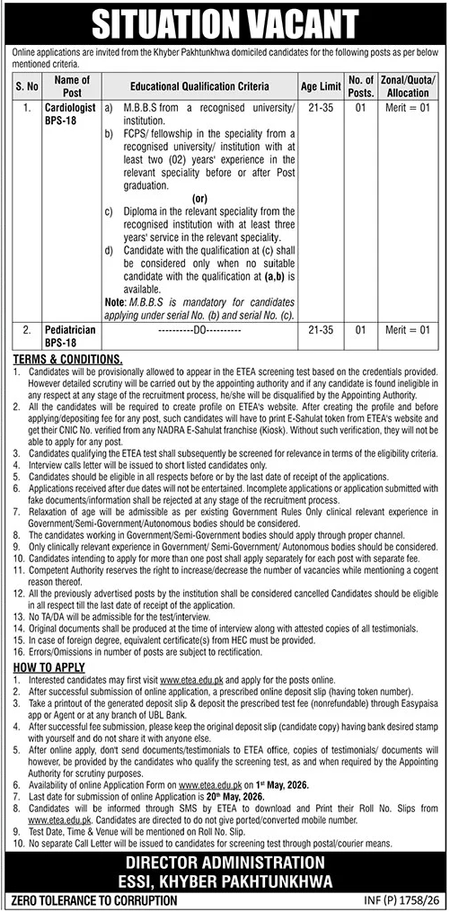 ESSI KP jobs 2026, ETEA medical jobs 2026, cardiologist jobs Pakistan government, pediatrician jobs KPK, doctor jobs KP health department, medical specialist jobs Pakistan, FCPS jobs Pakistan 2026, government hospital jobs KP, latest health department jobs KP, MBBS jobs Pakistan 2026, consultant doctor jobs KP, online apply ETEA jobs, medical officer jobs KP, KP govt jobs 2026 health sector, physician jobs Pakistan government.