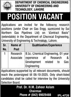 he Department of Chemical Engineering at the University of Engineering and Technology (UET), Lahore, is inviting applications for the position of Research Associate under the Chair on Gas Engineering, sponsored by Sui Northern Gas Pipelines Ltd. This is a contract-based position with the possibility of extension, designed for professionals interested in research and development in the field of gas engineering.
