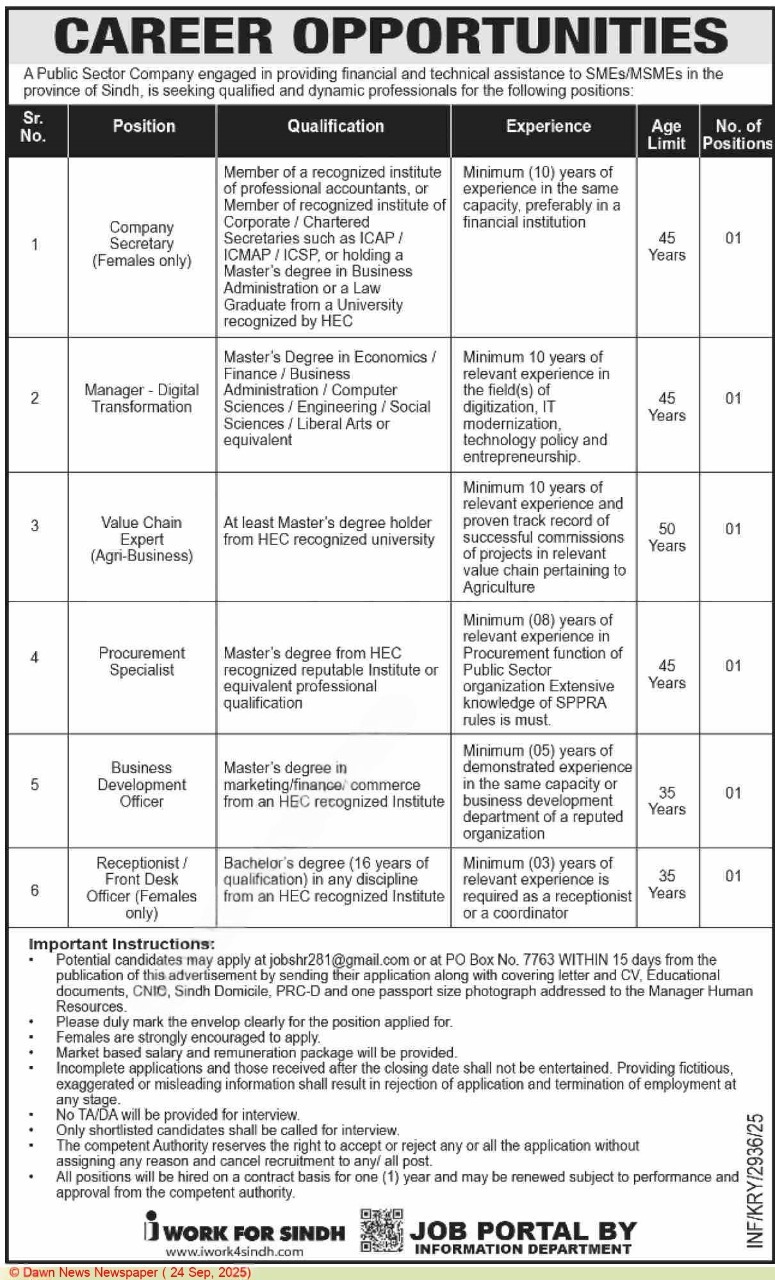 Apply for the latest public sector jobs in Sindh 2025. Positions available for Company Secretary, Digital Transformation Manager, Procurement Specialist, Value Chain Expert (Agri-Business), Business Development Officer, and Receptionist. Market-based salaries, contract-based roles, female candidates encouraged.