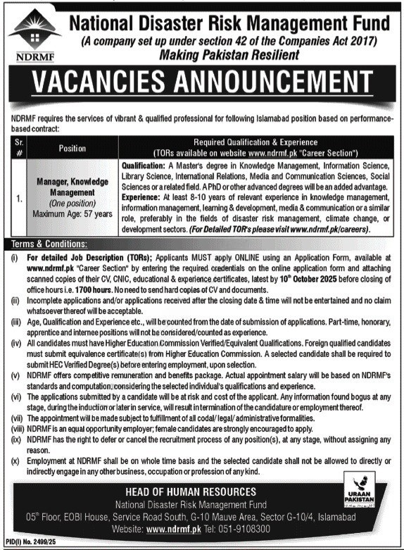 NDRMF jobs 2025, Manager Knowledge Management Islamabad, Disaster risk management jobs Pakistan, Knowledge management careers Pakistan, NDRMF recruitment, Development sector jobs Islamabad, Climate change management jobs, Learning and development manager Pakistan, Islamabad government jobs, Manager Knowledge Management Pakistan, Disaster risk management careers, Data analyst jobs Islamabad, Communications officer jobs Pakistan, Monitoring and evaluation jobs, Finance and accounts officer Pakistan, IT systems officer Islamabad, Development sector jobs Pakistan