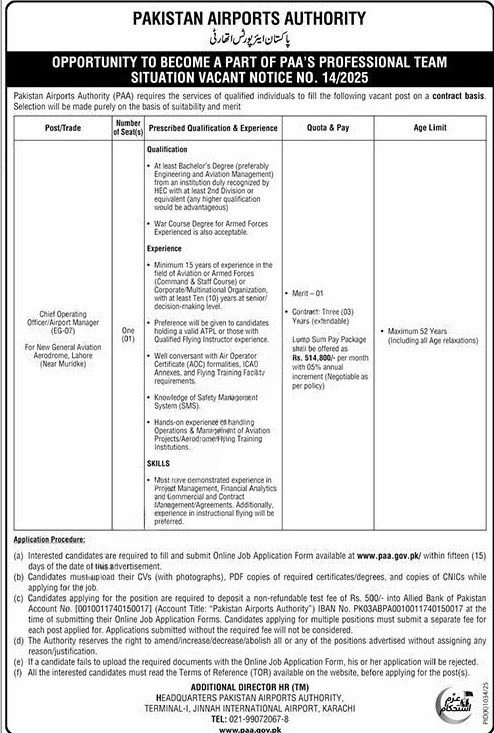 Opportunity to Become a Part of PAA’s Professional Team Situation Vacant Notice No. 14/2025 Pakistan Airports Authority (PAA) requires the services of qualified individuals to fill the following vacant post on a contract basis. Selection will be made purely on the basis of suitability and merit.