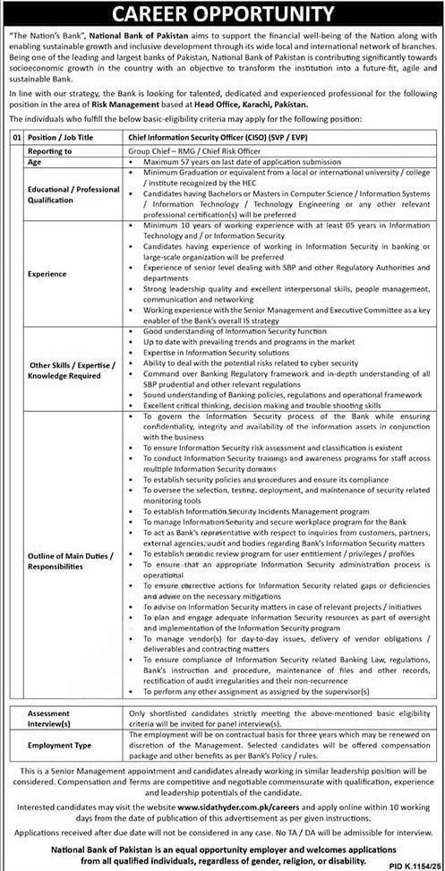 National Bank of Pakistan jobs 2025, Chief Information Security Officer NBP, CISO jobs in Karachi, Information Security jobs in Pakistan, Banking jobs in Pakistan 2025, NBP career opportunities, Risk management jobs Pakistan, Cybersecurity jobs in banks, NBP Karachi job openings, IT security officer jobs Pakistan, Chief Information Security Officer (CISO) and IT Professionals Jobs in National Bank of Pakistan 2025 – Apply Online, National Bank of Pakistan jobs 2025, Chief Information Security Officer NBP, CISO jobs in Karachi, Information Security jobs in Pakistan, NBP career opportunities, NBP Karachi job openings, Banking jobs in Pakistan 2025, Risk management jobs Pakistan, Cybersecurity jobs in banks, IT security officer jobs Pakistan, Data protection jobs Pakistan, Network administrator jobs Pakistan, Database administrator jobs Pakistan, Software engineer jobs in banks, IT audit officer jobs Pakistan, Compliance officer jobs Pakistan, Risk analyst jobs Pakistan Finance manager jobs Karachi, HR manager jobs Pakistan, Legal officer jobs in banks, Branch operations manager jobs Pakistan, Credit analyst jobs Pakistan, Internal audit officer jobs Pakistan, Treasury officer jobs Karachi, Marketing manager jobs in banking, Digital transformation jobs Pakistan, IT Security Officer jobs, Network Administrator jobs, , jobs Database Administrator, Software Engineer jobs , IT Audit Officer jobs , Risk Analyst jobs, Compliance Officer jobs, Finance Manager jobs, HR Manager jobs, Legal Officer jobs. Branch Operations Manager jobs, Credit Analyst jobs, Treasury Officer jobs, Internal Audit Officer jobs, Marketing and Digital Transformation Specialist