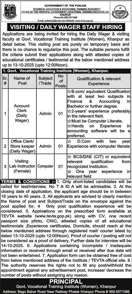 Applications on the prescribed form available at the TEVTA website (www.tevta.gop.pk) along with one recent passport-size photo, CNIC, attested copies of all educational testimonials, experience certificates, and domicile must reach the office by 13-10-2025 (upto 12:00 Noon).