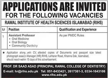Rawal Institute of Health Sciences (RIHS) Islamabad is inviting applications from skilled and motivated professionals to join its faculty team. The institute is offering positions for Assistant Professors in Oral Medicine, Oral Biology, and Community Dentistry.