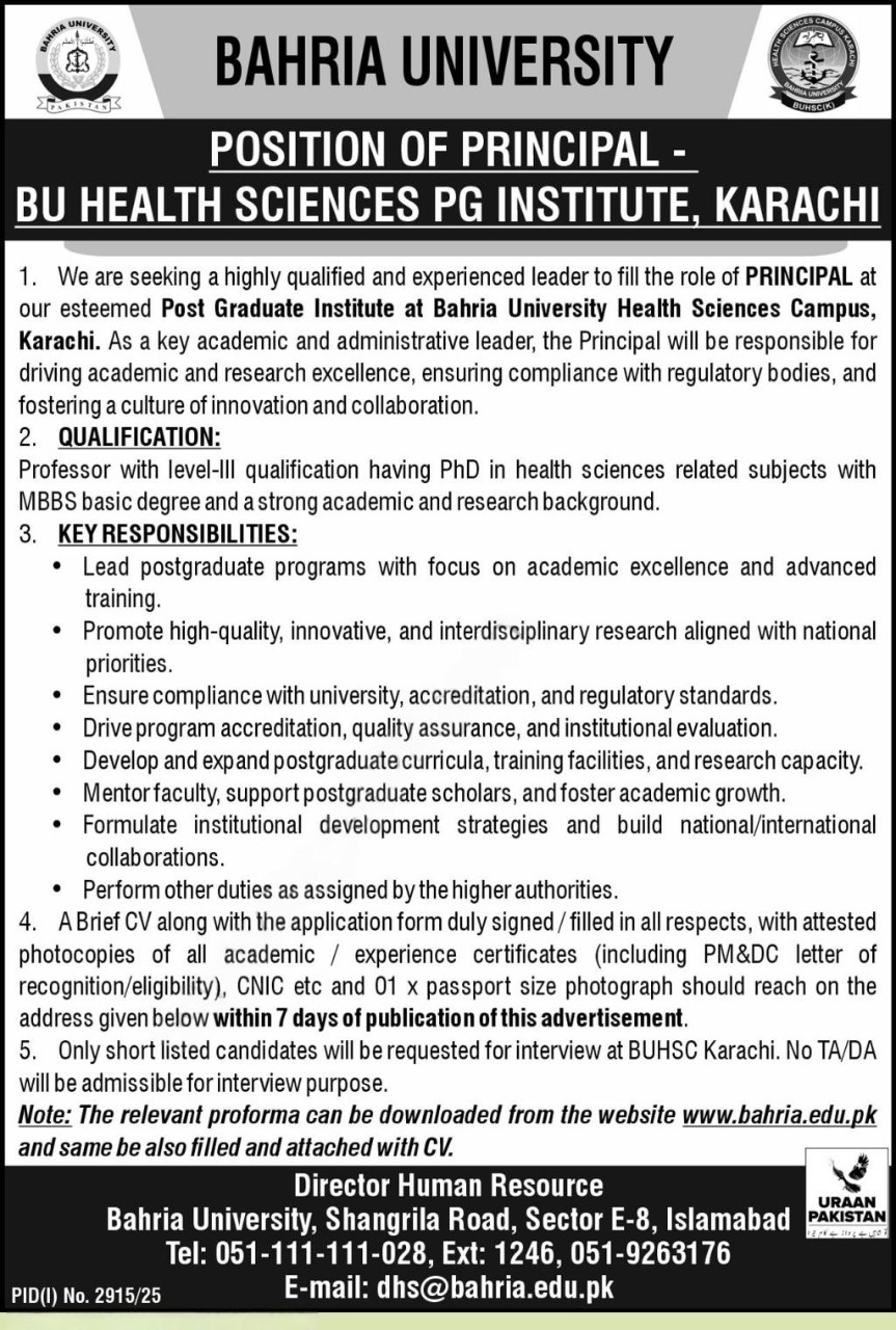 Principal, Bahria University, Health Sciences, Postgraduate Institute, Karachi, Academic Leadership, Research Excellence, PhD in Health Sciences, MBBS Degree, Level-III Professor, Higher Education, Medical Education, Institutional Development, Faculty Mentoring, Curriculum Development, Accreditation Compliance, Academic Administration, Research Management, University Jobs Pakistan, Bahria University Careers, Academic Hiring 2025, Healthcare Education, Teaching and Research, Leadership in Education, Academic Quality Assurance, Academic Leadership Pakistan Medical Research Leadership,, Higher Education Management, University Faculty Recruitment, Academic Policy Development, Postgraduate Academic Programs, Health Sciences Education Pakistan, Research and Innovation, Academic Governance, Educational Quality Standards, University Principal Jobs, Academic Career Opportunities, Public Sector Universities Pakistan, Academic Program Development, Healthcare Research Management