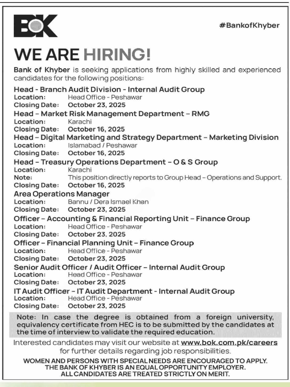 The Bank of Khyber has announced multiple career opportunities for October 2025. The available positions include Head of Branch Audit Division based at the Head Office in Peshawar, Head of Market Risk Management Department in Karachi, Head of Digital Marketing and Strategy Department in Islamabad or Peshawar, and Head of Treasury Operations Department in Karachi. Other openings include Area Operations Manager for Bannu and Dera Ismael Khan, Officer in the Accounting and Financial Reporting Unit, and Officer in the Financial Planning Unit, both based at the Head Office in Peshawar. The bank is also hiring Senior Audit Officer or Audit Officer, and IT Audit Officer, with placements at the Head Office in Peshawar. Positions posted on October 2 and 3, 2025, have application deadlines between October 16 and October 23, 2025. Interested candidates can apply online at www.bok.com.pk/careers. Women and persons with special needs are encouraged to apply, as the Bank of Khyber provides equal employment opportunities based on merit.