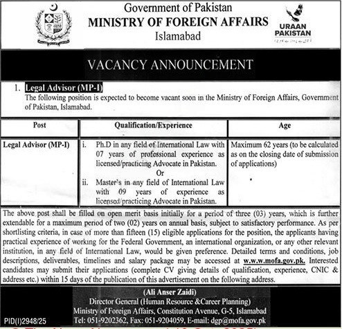 Legal Advisor, International Law, Ministry of Foreign Affairs, Government of Pakistan, Islamabad Jobs, Legal Consultant, Diplomatic Affairs, Treaty Law, Foreign Policy, International Relations, Legal Expert, Advocacy, Contract Jobs, MP-I Scale, Public Sector Careers, Legal Policy Advisor, International Agreements, Law and Diplomacy, Legal Framework, Foreign Service, Legal Advisory Role, Legal Affairs Division, Pakistan Government Jobs, Legal Compliance, International Legal Expert, Policy Development, Government Hiring Pakistan, Legal Representation, Constitutional Law, Public International Law, Legal Research, Legal Drafting, Government Legal Advisor, Legal Officer, Human Rights Law, Arbitration and Mediation, International Treaties, Law Reforms, Legal Documentation, Legal Strategy, Government Counsel, Legal Recruitment Pakistan, Senior Legal Position, Legal Administration.