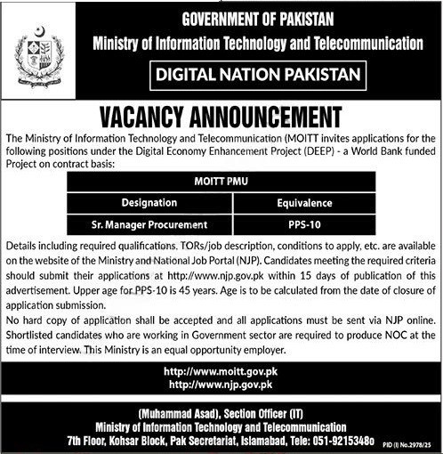 Senior Manager Procurement jobs, PPS-10, Digital Economy Enhancement Project, DEEP Pakistan, Ministry of IT and Telecommunication, MOITT, Procurement Management, Contract Management, Tender Evaluation, Vendor Management, Procurement Policies, Public Procurement Rules, E-Procurement, Project Procurement, World Bank Funded Project, Digital Projects, Supply Chain Management, Procurement Planning, Contract Negotiation, Government Jobs Pakistan, Online Application NJP, NOC Required, Pakistan IT Sector Jobs, Digital Economy Jobs, Project Management, Procurement Officer, Senior Procurement Officer, IT Procurement, Government Procurement, Public Sector Procurement, Government Contracting, Compliance Management, Procurement Strategy, Procurement Lifecycle, Procurement Documentation, Supplier Evaluation, Contract Administration, Risk Management, Tender Documentation, Procurement Reporting, Strategic Sourcing, Procurement Compliance, Vendor Contracts, IT Project Procurement, Digital Infrastructure Projects, Procurement Coordination, Project Implementation, Procurement Officer Jobs, Ministry of IT Careers, DEEP Project Pakistan, Pakistan Government Jobs, Federal Government Jobs, Digital Transformation Jobs