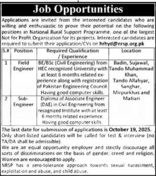 Field Engineer, Sub Engineer, NRSP jobs, civil engineering jobs, Sindh jobs, construction jobs, project-based jobs, engineering careers, Pakistan NGO jobs, development sector jobs, rural development, infrastructure development, DAE Civil jobs, PEC registered engineer, BE Civil jobs, BSc Civil jobs, NGO engineering jobs, technical jobs in Sindh, Badin jobs, Sujawal jobs, Mirpurkhas jobs, Sanghar jobs, Tando Muhammad Khan jobs, Tando Allahyar jobs, Matiari jobs, site engineer jobs, field supervision, project implementation, civil works, technical field staff, community infrastructure, NRSP vacancies 2025, engineering employment, rural support programme, social development, non-profit jobs, field-based roles, site management, project monitoring, structural works, engineering diploma, engineering graduate jobs, field project jobs, Sindh development projects, technical support, field construction, road and building projects, development NGO, engineering consultancy, survey and design, job opportunities Pakistan, hydrology projects, infrastructure sector, field operations, technical workforce, equal opportunity employer, civil engineering projects, women encouraged to apply, project staff hiring, engineering recruitment, project management, construction supervision.