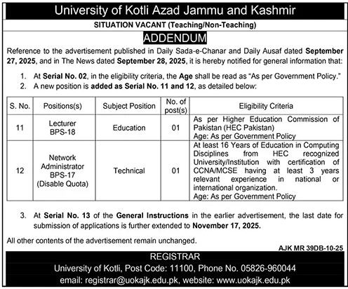 The University of Kotli Azad Jammu and Kashmir has announced new vacancies for teaching and non-teaching positions. The updated notice includes two new posts: Lecturer in Education and Network Administrator under the disabled quota. The university has also revised the age criteria to follow the government policy and extended the application deadline to November 17, 2025. Qualified candidates are encouraged to apply and become part of a growing public university focused on academic excellence and professional development.